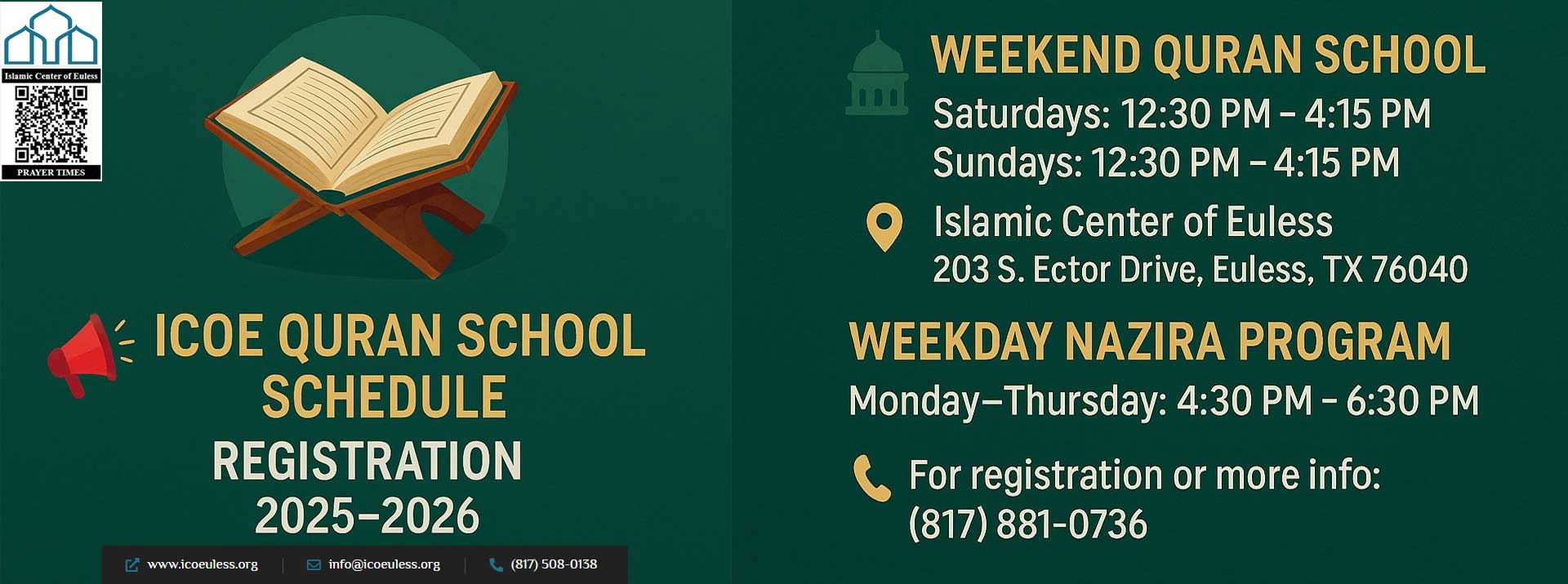The aim of this Islamic Center of Euless is to create a link between Islam and the general masses in order to provide a platform for the propagation of Deen and continuation of the study of Deen, also provide quality of Education and provide future generation Imams by engaging youth. We are excited to announce our Weekend Quran School, held every Saturday and Sunday, offering a comprehensive program for children and adults.